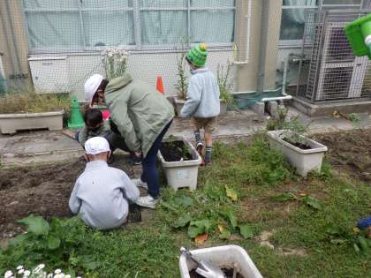 今年は理科の学習でツルレイシを班で育てることになりました。その他にも季節に合った作物を育てようということで,「ピーマン・きゅうり・万願寺・とうもろこし」などの野菜を育てます。子どもたちは進んで,畑を耕して準備を進めています。