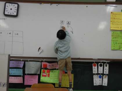 今日もひらがなを練習しました。先生が言ったひらがなを探して,そのひらがなを使って言葉を作ります。今日は「あり」と「そり」と「はこた??」が完成しました。これからも語彙を増やしていってほしいです!