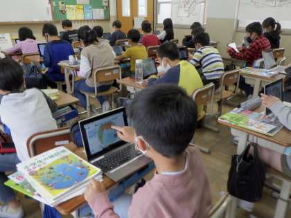 授業で使った資料にコメントや説明のための印を付け,様々な見方で日本の位置を表しました。タブレットを使いこなして説明し合う方法にも慣れてきました。