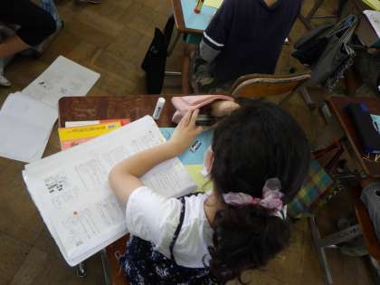 国語科「白いぼうし」の学習では,ファンタジー作品に親しんでいます。たくさん本文から読み取れる不思議な場面を見付け,その不思議を解決するための叙述をたくさん見つけています。読めば読むほど不思議への解決のヒントが見つかり,子どもたちも楽しんで学習に取り組めています。今日は見つけた証拠を「ふしぎのとびら」に書き込みました。