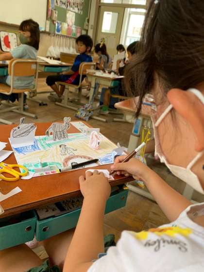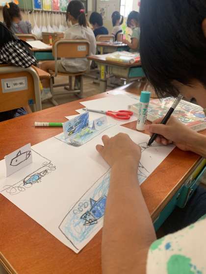 今日の図工では,紙を折り,立ててみた形から想像し,