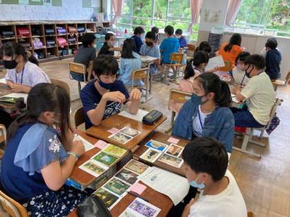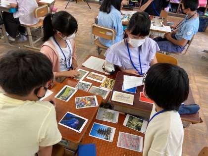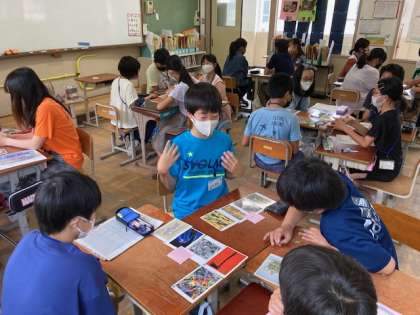 図画工作科『アートカードを使って』の単元で,有名な絵画や写真,建造物や彫刻物などの作品を載せたアートカードを使って,鑑賞する学習を行いました。ただカードを鑑賞するだけでなく,グループにいろいろな種類のカードをランダムに15種類配布し,それらを仲間分けする活動を行いました。着目する点によって仲間の分け方を異なり,悩みながらグループでじっくり相談する姿がありました。仲間分けを終えたグループから,仲間ごとにイメージにぴったりの名前を決めました。ユニークな名前も飛び出し,表現豊かな仲間分けとなりました。
