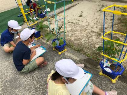 自分が育てている野菜をじっくり見てから,野菜の何を観察するのかや,前の観察から変わったことを捉えます。そして色や形,大きさや触ったかんじなど,観察したことを詳しく記録文に書きました。