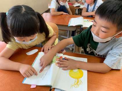 「おおきなかぶ」の学習では,音読発表会にむけて,声に出して読むことを学習しています。隣の席の友だちと,一緒に読みながらお話の内容を確認していきました。