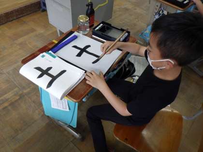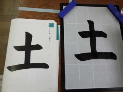 今日は3回目の習字の学習でした。準備も自分たちでテキパキと行っている姿がとても素晴らしかったです。今回は初めて「縦画」のある漢字を書きました。横画を書く時と同じように,穂先を45度にしてスーッと筆を下ろして書きました。とても力強い「土」を書くことができました。
