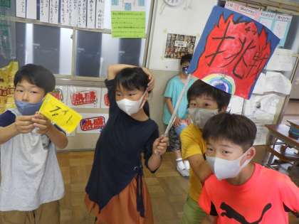 今回,隣のクラスの4年2組から「挑戦状」がやってきました。挑戦してきたのはクイズ・ドッジボール対決です。子どもたちは,それに向けて作戦を考えて,それぞれの応援グッズも作りながらこの日をたのしみにしていました 。