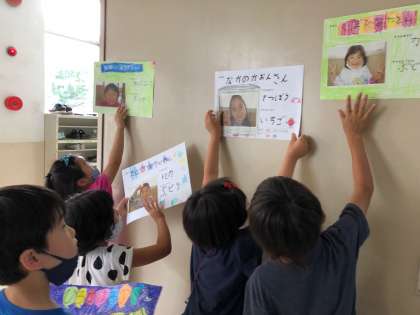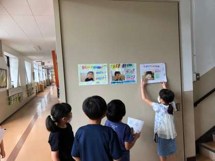 1年生の紹介カードを学校中に掲示して,全校のみんなに1年生のすきなものを伝えました。