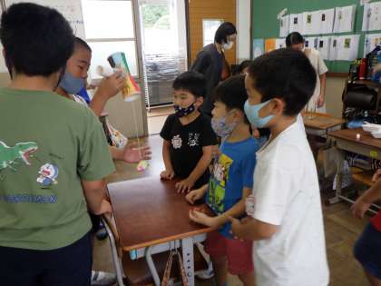 すべて手作りのおもちゃは,どれも面白く,1年生も興味深々です。