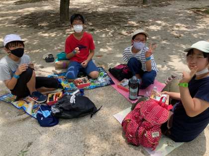 資料館前にてお昼ご飯タイムです。