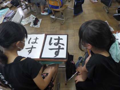 書写の学習では「はす」を書いています。どうすれば良い字になるかアドバイスしながら練習を重ねています。毛筆ならではのむずかしさも感じながら楽しんで取り組めています。