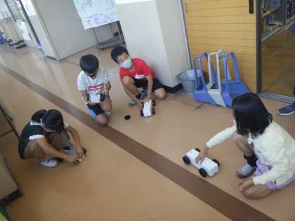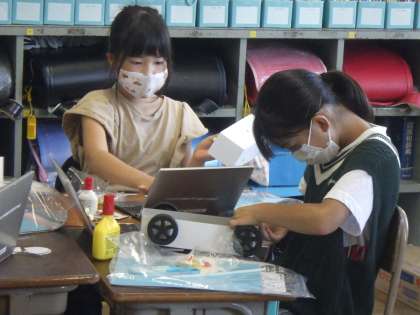 図画工作科では,車作りをしています。どうすれば速く走れるようになるかやオリジナルの車を作りたいという思いから,それぞれの工夫をしています。早速,走らせてみて試行錯誤しながら作っていく楽しみを感じています。