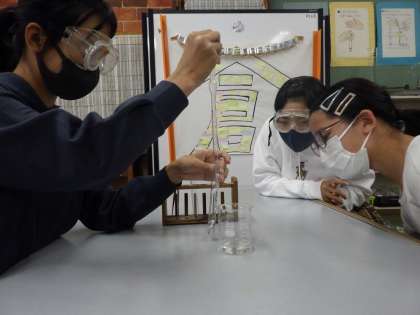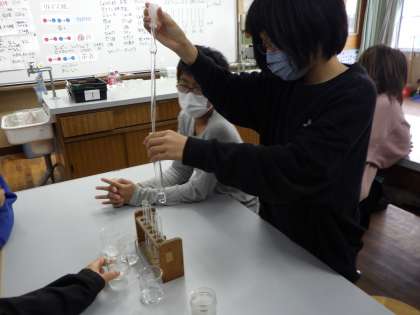 「石灰水が緑色になった!」「それぞれの水溶液の濃さも違うなぁ。」