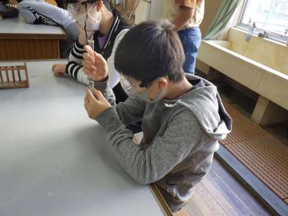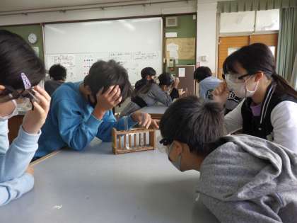 6年生の理科では「水溶液の性質」に取り組んでいます。アルミニウムや鉄に塩酸を加えるとどうなるか興味津々です。