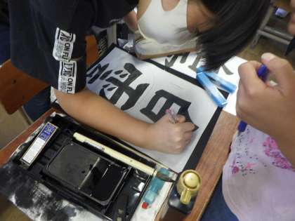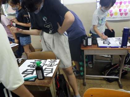 練習後それぞれの文字を見せ合い,赤ペンでいい所,青ペンでアドバイスをお互いに書き込み,清書に活かします。くり返ししているこの交流のおかげで,書くときのポイントがはっきりと分かるようになってきたようで,清書をするときにはより意識して書くことができるようになってきました。