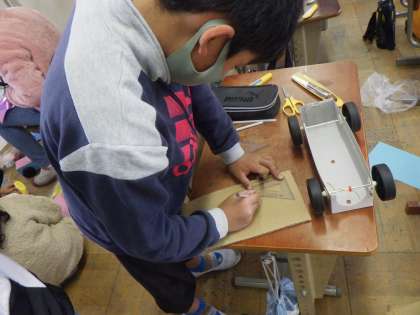 2組でも,いろいろ工夫をしている姿が見られます。どうすれば速く走るのか,ゴムを太くしたり数を増やしたり・・・試行錯誤しながら,作り上げる楽しさに夢中なようです。