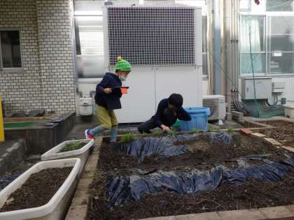 「寒くなってもちゃんと芽が出るんだね」「にんじんの芽はトトロに出てくる芽に似ているね」といいながら触ったり,長さを測ったりしながら観察をしました。寒さに負けず,おいしい野菜になりますように!