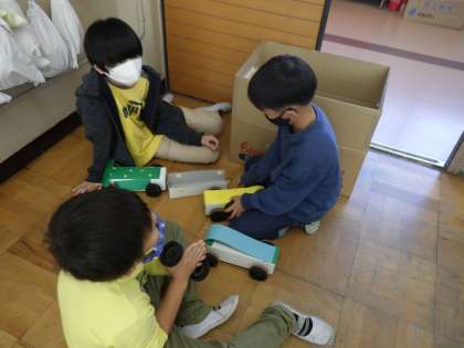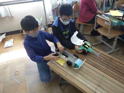 図画工作科では,ゴーゴドリームカーを作っています。デザイン・動き・スピードなど,自分がこだわりたい部門に分けて,工夫ができてきました。さらに良くしたい!と思いをもって夢中になって取り組んでいます。