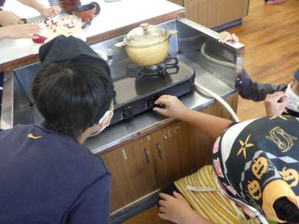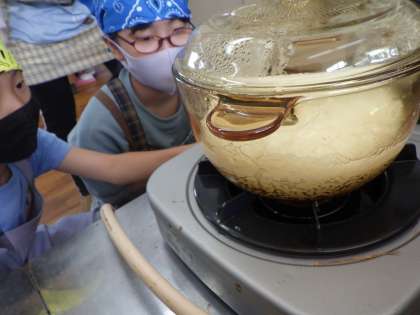 洗ったり浸したりする時間,炊くのを維持するときの火加減,いつまで火を入れるか・・・ずっと鍋のそばについていなければならず,大変な思いをしながら見守りました。鍋の中の変化に敏感に気がつき,話し合いながら次の行程に移っていきました。