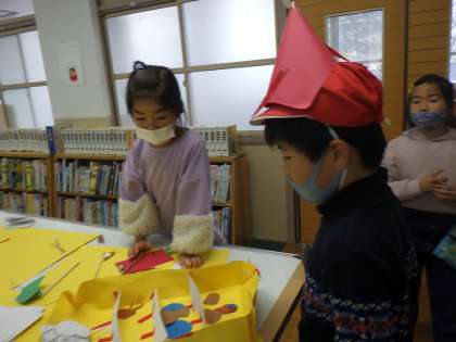 1年生に本の読み聞かせをした後,クリスマスブースを開催しました。プレゼント釣りやピンボール,ボーリングやクリスマス色塗りコーナーなど,6つのブースが開かれました。1年生も大喜び!!時間いっぱいっぱい回っていました。すべて3年生が考えたと聞いて1年生の先生も驚かれていました。2部屋を使って開催したので,もう1つの部屋に宣伝に行くお友だちもいました。3年生の子どもたちの発想は無限大です。もっともっと生かしていければと思っています。