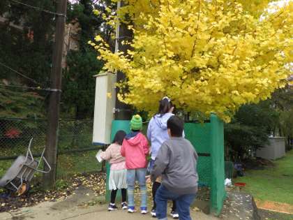 岩倉北にやってきた秋を見つけています。子どもたちはタブレットを使い,夏とは違う風の音まで撮影をしていました。色づいたイチョウやモミジの葉,どんぐりをひろい,張り付けて作品作りも楽しくできました。