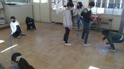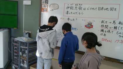 社会科の単元『江戸の文化と新しい学問』の学習で,50代半ばから天文学や測量術を学び,72歳までに全国を測量し,日本地図を完成させた伊能忠敬について学習しました。当時,忠敬らが行った測量方法を学習する中で,みんなで実際に当時の測量方法を再現しながら距離を測ってみました。各班に長い紐1本を渡し,基準とする歩幅(足の大きさ)だけ測ることを条件として距離を測る活動を行いました。各班,思い思いに測量方法を工夫し,実際の距離に近づくように取り組んでいました。当時の人々がどのように工夫・苦労して全国を測量したのかを知る機会になったのではないでしょうか。