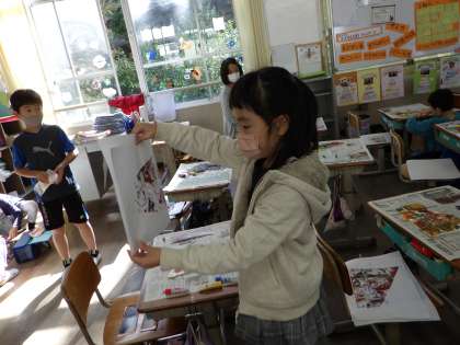 葉っぱをコラージュした後は,ローラーで絵の具をのせていきました。