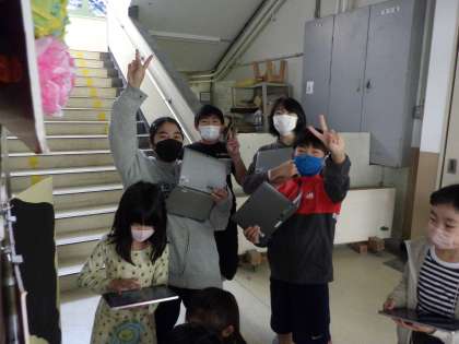 イワキタ秋フェスが始まりました。なんと今年の怪盗マツムーは来年完成予定の大切な大切なみんなの体育館を狙ってるようです。そんな怪盗マツムーの狙いを阻止するには学校中に散りばめられたヒントをQRコードで読み込んでクイズに答えなければいけません。中間休みからマイタブレットを持って,みんなでクイズに挑戦しました。コードを読み込むと,「動画が始まった!」「これは〇年ちゃうかな。」と話しをしながら進めています。