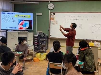 3日(金)の6校時に洛北中学校の先生に来校していただき,出張授業を行っていただきました。理科の授業では『光のスペクトル』という内容で,身の回りある『光』を改めて見直してみて,いったい光は何色あるのかについて調べました。授業の中で,人間には見えていない光の種類がたくさんあることや光が波になって伝わっていることを知ることができました。実験ではアルミ缶を使って『簡易分光器』を作って,可視光線が7色であることをみんなで体感することができました。中学校の専門的な学習に,みんな興味津々で来年から始まる中学校の授業が楽しみになる時間となりました。