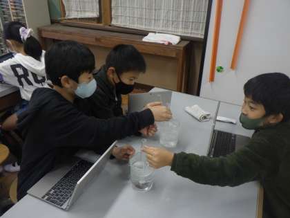 理科では,温度の変化によって空気や水の体積はどのように変化するのか実験をしています。班で協力して実験を進めていくことができています。タブレットのカメラ機能を使って,実験の記録を残すことで,経過がとても分かりやすく,結果にまとめていくことができました。