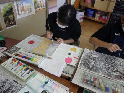 図画工作科では刷った版に色付けをしています。白い部分を丁寧に絵の具で塗り進めることができています。完成まであと少しです。