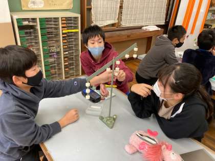 そのあと理科室にある決まった重さのおもりでは釣り合わない場合,自分の身の回りのペンで水平になる条件を整えている班もありました。筆箱の重さも実験用てこを使って分かったようです。