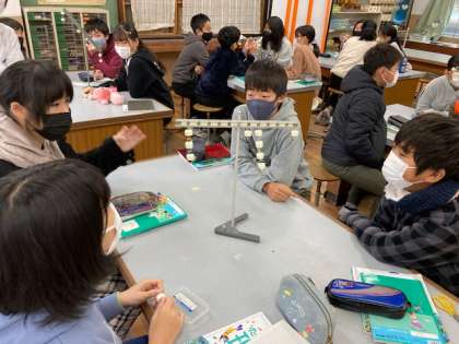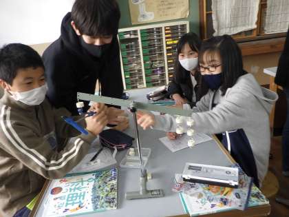 片方におもりを吊るしてから,釣り合わなときと釣り合うときの違いを見つけながら条件を整えて調べてみます。「めもりの4に吊るすとだめだ。」「めもりとおもりの重さをかけると同じ数やな。じゃあここは20gになる。」と話し合いながらきまりを見つけることができました。