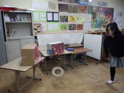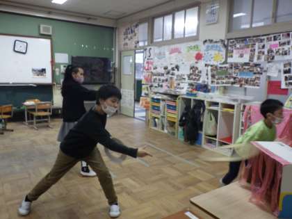 続いて,ダンボールで的当てを行いました。実は朝からホワイトボードに的当ての点を書いて不自然な3学期の幕開けでしたが,思いっきりダンボールを当てて「〇点当たったよ。」と嬉しそうに次々報告してくれました。