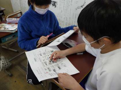 「Go straight for two blocks.」と地図を指さしながら答えています。聞き手もうなずいたり,OKと答えたりしながらやりとりしている姿がありました。子どもたちはこれまでの学習が少しずつ力になっていることが実感できたようです。やりとりの最後には「Have a nice day!」と手を振っている子もおり,やりとりをして良かったなぁ,嬉しいなぁという気持ちをもたせてくれる表現をしていました。