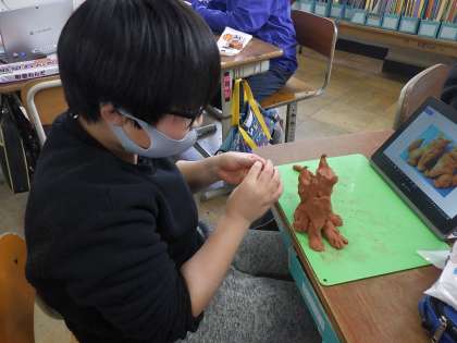 図画工作科では沖縄の守り神「シーサー」を彫塑ねんどで作りました。久しぶりの粘土に高まり,楽しみながら取り組むことができました。ひとりひとりのシーサーの表情や動きがあってにぎやかになりました。