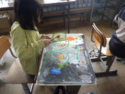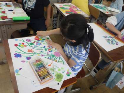 図画工作科では,「まぼろしの花」を描いています。伝説の,この世にはない,ふしぎな・・・・それぞれが思う花に近付いてきました。前回の図工の学習で学んだ5つの技を使って,さらにレベルアップし,完成することができました。