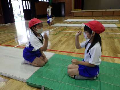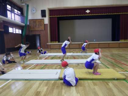 小学校生活で,初めてのマット遊びをしました。今日はマットの上でいろいろな動物になりきって,進んでいきました。たくさん腕や足を使って疲れている様子もありましたが,笑顔があふれる体育の時間となりました。