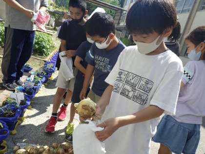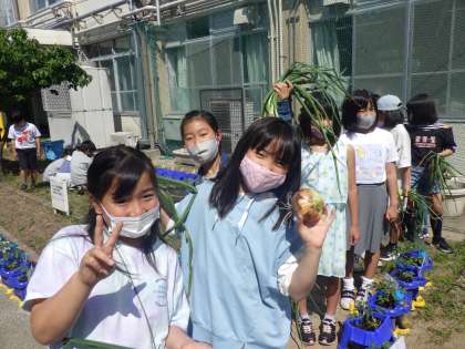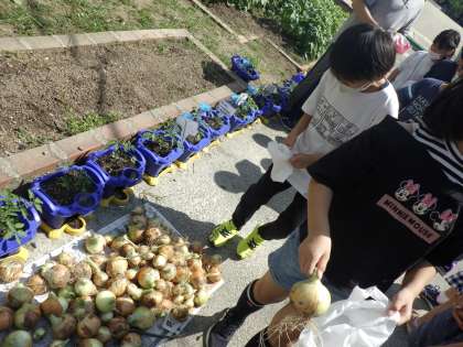 昨年度植えたたまねぎが大きくなり,収穫しました。。大きく育ったたまねぎを見て,子どもたちも大興奮。地域の方には,たくさんおお手伝いをしていただき,たまねぎを育てるにあたってお世話になりました。本当にありがとうございます。野菜を育てる楽しさを改めて感じれたようです。