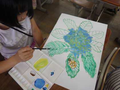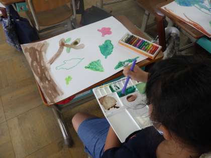 いろんな絵の具を混ぜたり,水を混ぜたりして描いています。