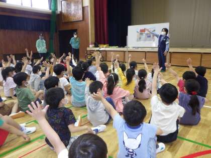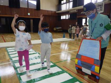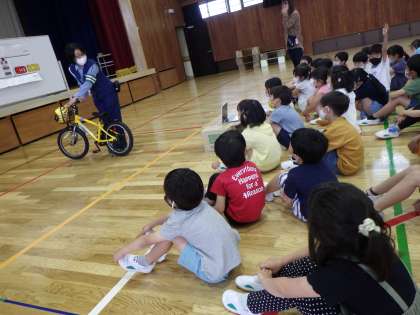 警察署からお巡りさんと交通指導員さんをお招きし,横断歩道の安全な渡り方や,自転車の乗り方,交通ルールについて体験的に教えていただきました。