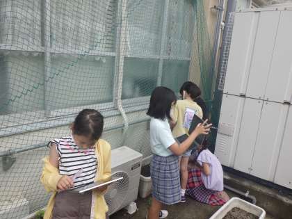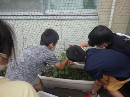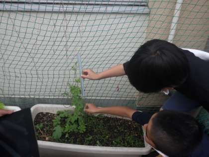 理科では,ツルレイシの成長も観察しています。4月の時よりもずいぶん大きくなり,今日のみんなの発見は”まきひげ”です。頑張って大きくなろうとしているツルレイシがつるがのび,くるんとまきひげがついています。大きくなっているツルレイシの様子を見て,もっともっと大きくなるのが楽しみになったようです。