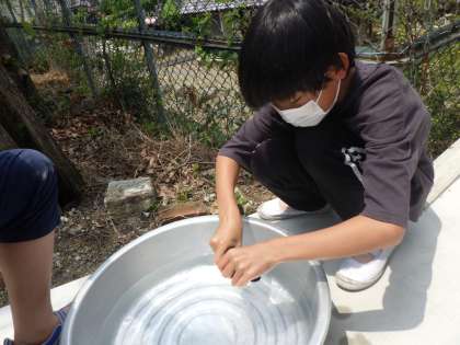 洗剤を落とすため,数回水を変えながらすすいでしぼることをくり返しました。