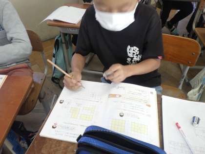 算数では「面積」の学習が始まりました。1センチメートルのますめを使いながら数を数えて広さを求めています。さあ,どうすればもっと簡単に面積を求められるのかを考えていけたらと思います。