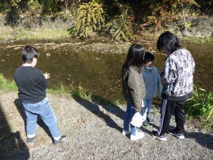 岩倉川へ探検に行き、水のはたらきによって浸食されたところや岩の形を観ました。「ほんまに削られてる!!」「石がごつごつしてるなあ」と言って、学習したことを実際に確認する姿が見られました。