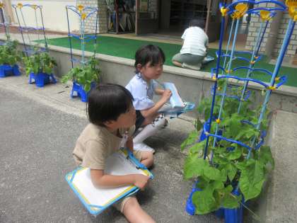 気温がどんどん高くなり、育てている朝顔がぐんぐんと大きくなっています。今日は朝顔の様子を観察しました。どんどん葉が大きくなり茎も伸びている朝顔を真剣な表情で子ども達は絵に表していました。これからの成長も楽しみです。