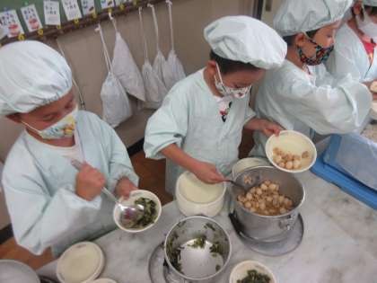 給食当番の活動がどんどん上達しています。ていねいに配膳できるようになってきています。子ども達にもどんどん自信を身につけています。