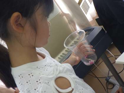 音が出るときのもののふるえ方を目で見るために、ビーズや輪ゴムを使って実験しました。