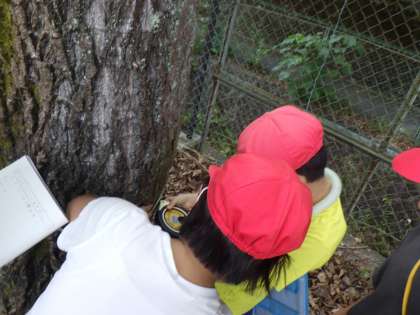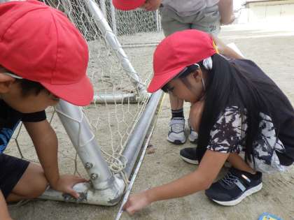 以前と比べて、長いものを測ります。今日は巻尺を使って、サッカーゴールや体育倉庫の長さを測ったり、木のみきの周りを測ったりしました。予想よりも長いと感じた子が多かったようです。実際に測ってみるのは大切だなと感じました。