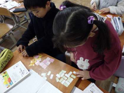 長方形・正方形・直角三角形の色紙を使ってもようづくりをしました。活動を通して、長方形をたくさん組み合わせると正方形ができたり、直角三角形を2枚組み合わせるとまた直角三角形ができたり、様々な気づきがありました。