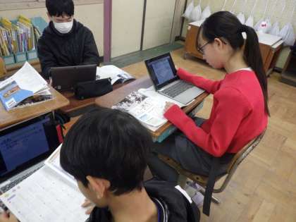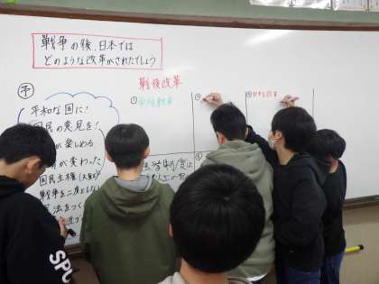 戦後の改革でどんなことをしたのか、グループで話し合い、ホワイトボードに書きだしました。